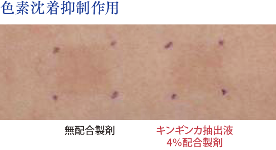 キンギンカ抽出液4%配合製剤をヒト皮膚に塗布して紫外線を照射した実験では、紅斑抑制作用と色素沈着抑制作用が認められています。