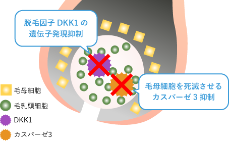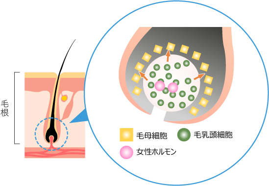 髪は、毛根の底にある毛乳頭細胞が毛母細胞に増殖指令を出すことで、毛母細胞が細胞分裂を繰り返して髪を成長させていきます。