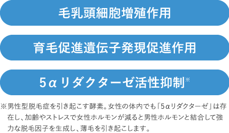 女性ホルモンの減少とともに、毛髪が細く・短くなるというお悩みは増加してしまいます。そこで三省製薬は、そのお悩みに答えるために注力し、数々の成分を開発してまいりました。