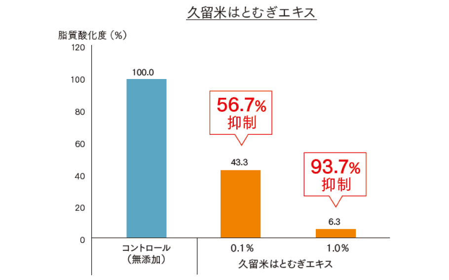 水溶性の久留米はとむぎエキス、油溶性ヨクイニン抽出液ともに、皮脂の酸化を抑制する抗酸化作用が認められています。皮脂は健やかな肌を守るために欠かせないものですが、過剰に分泌された皮脂が酸化すると肌トラブルを引き起こし、シミ、シワ、肌あれなどの原因にもなります。皮脂の酸化は頭皮でも起こるため、不快臭やかゆみなどの頭皮トラブル、さらに白髪や抜け毛にもつながります。
