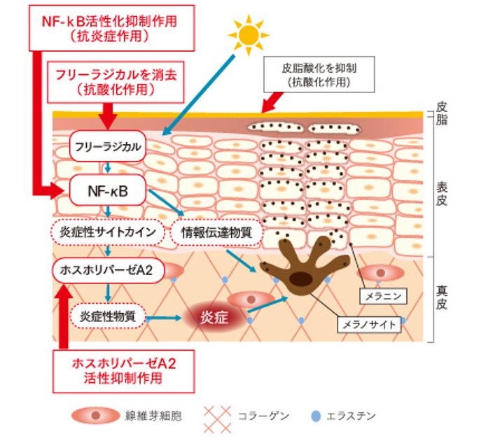 「ドクダミ抽出液」が毛穴の目立ちを抑えるほどの強力な抗炎症力を持つ理由は、3つの段階で炎症を抑える作用にあります。外的刺激などを受けてから炎症が起きるまでのメカニズムを要所要所でブロックすることで、炎症の発生を徹底的に防ぎます。