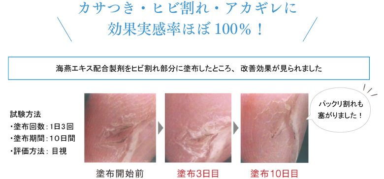 海燕エキスとは、日本にも生息しているイトマキヒトデのエキスです。海燕エキスは肌荒れの改善力がかなり高く、三省製薬調べによると、実際に海燕エキスを配合した製剤を使用した人のほぼ全員が、肌荒れ改善効果を実感しました。パックリ割れた痛そうな指先や、カサカサの皮剥けも、わずか数日でなめらかに!