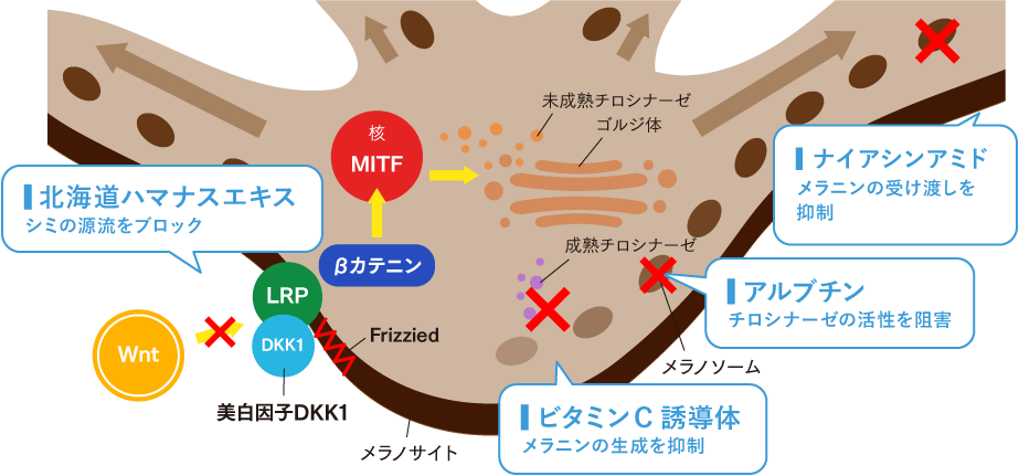 このように、美白因子DKK1 は言ってみれば、シミの素が作られる源流部分をブロックする作用を持っています。