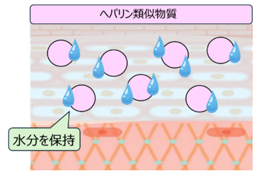 「ヘパリン類似物質」は角質層まで浸透し、浸透した成分が水分を保持することで、肌のうるおいを保ち、乾燥を防ぎます。