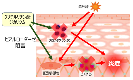 紫外線を浴びると発生する、炎症のもととなる「プロスタグランジン」を阻害する作用や、「ヒスタミン」の産生にかかわる「ヒアルロニダーゼ」を阻害する働きがあります。肌荒れを防ぎ、すこやかに保ちます。