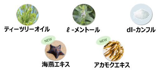 「ティーツリーオイル」、「ℓ-メントール」、「dl-カンフル」に加え、今回は「海燕エキス」と「アカモクエキス」を新配合しました。