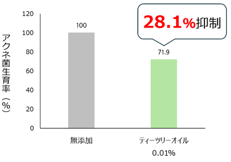 また、当社の研究により、「ティーツリーオイル」にはニキビを防ぐことに役立つ可能性を確認しました。0.01%のティーツリーオイルの添加で、アクネ菌の生育を28.1%抑制することを確認しています(2025年)。