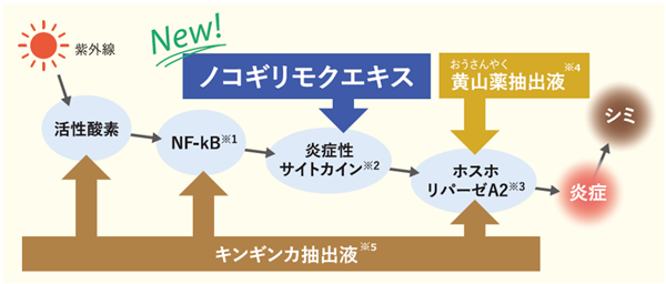 従来配合の「黄山薬抽出液(※4)」、「キンギンカ抽出液(※5)」、に加え、今回、「ノコギリモクエキス」を新配合したことにより、肌内部で炎症につながる連鎖反応にさらに多角的にアプローチし、かくれ炎症をケアします。